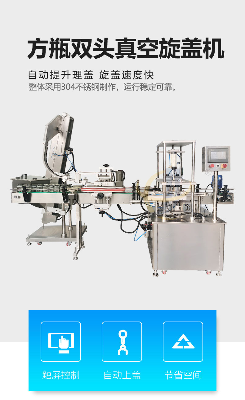 方瓶雙頭真空旋蓋機(jī)獨(dú)特的設(shè)計(jì),可兼容多種不同形狀,尺寸的瓶子旋蓋,兼容性強(qiáng),且調(diào)整方便;真空壓力可調(diào),觸摸屏人機(jī)界面操作簡(jiǎn)單方便。