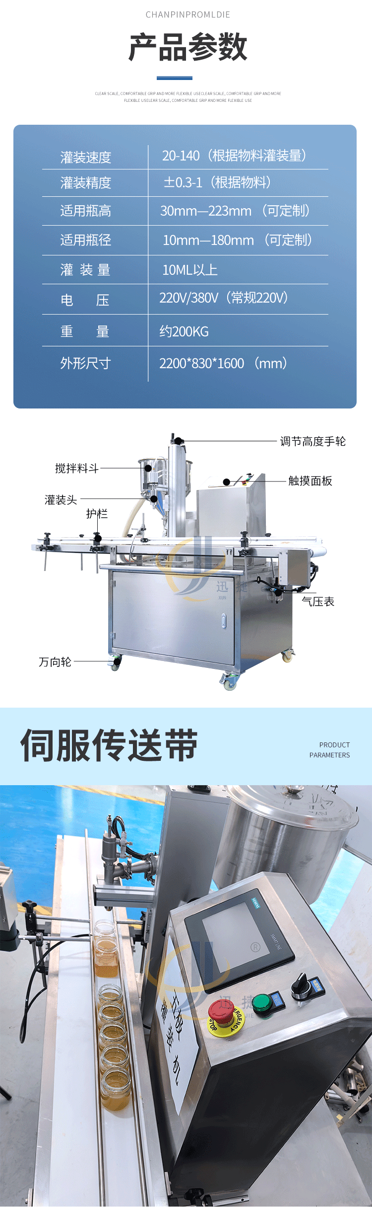 五極灌裝機(jī):極快-單頭2200瓶/時(shí) 極簡(jiǎn)-操作簡(jiǎn)單 極廣-啥啥都能灌 極穩(wěn)-24小時(shí)不停機(jī) 極準(zhǔn)-200g誤差小于1g。它可以和真空旋蓋機(jī)搭配使用。